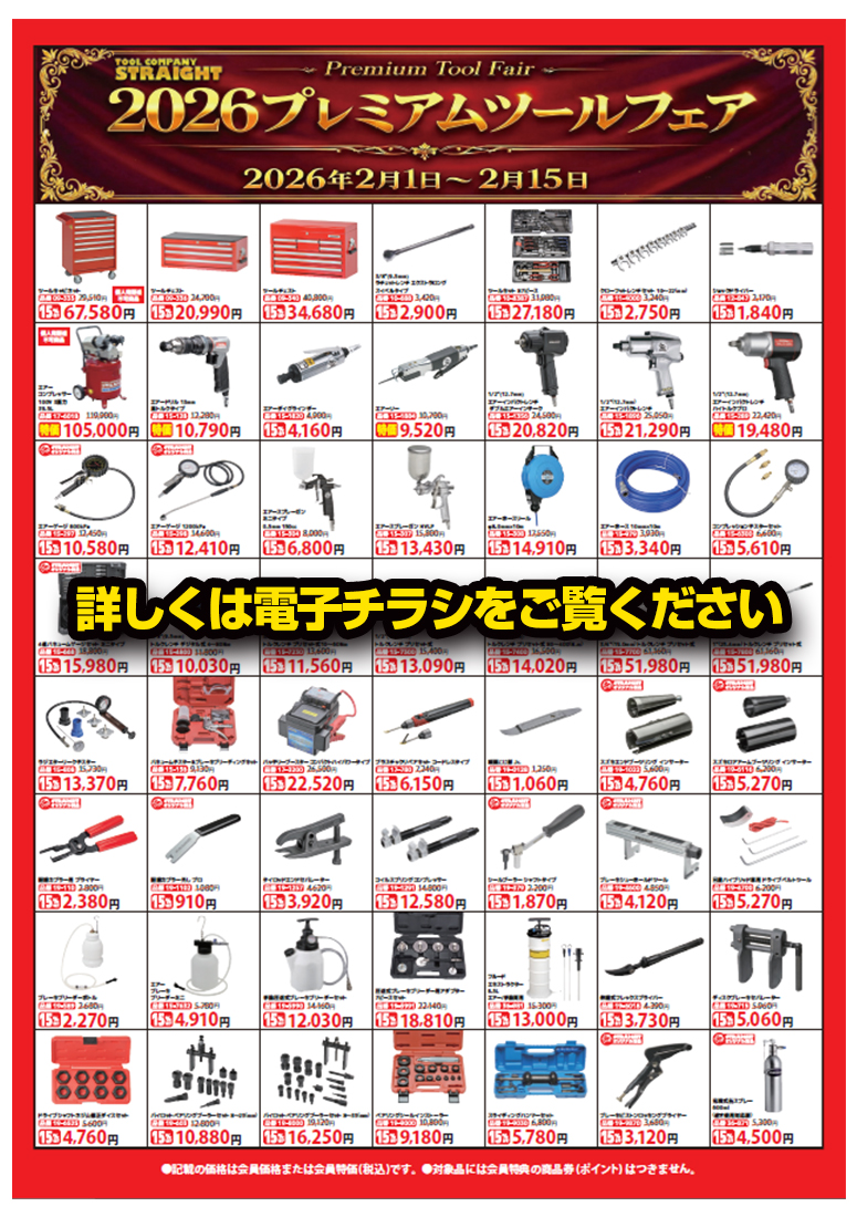 タイトル 開始日 終了日 対象 広告 品質と機能に自信!『プレミアムツールフェア』開催! 2026/02/01 2026/02/15 全店舗、公式ネットショップ、各ネットモール、通信販売(TEL/FAX)